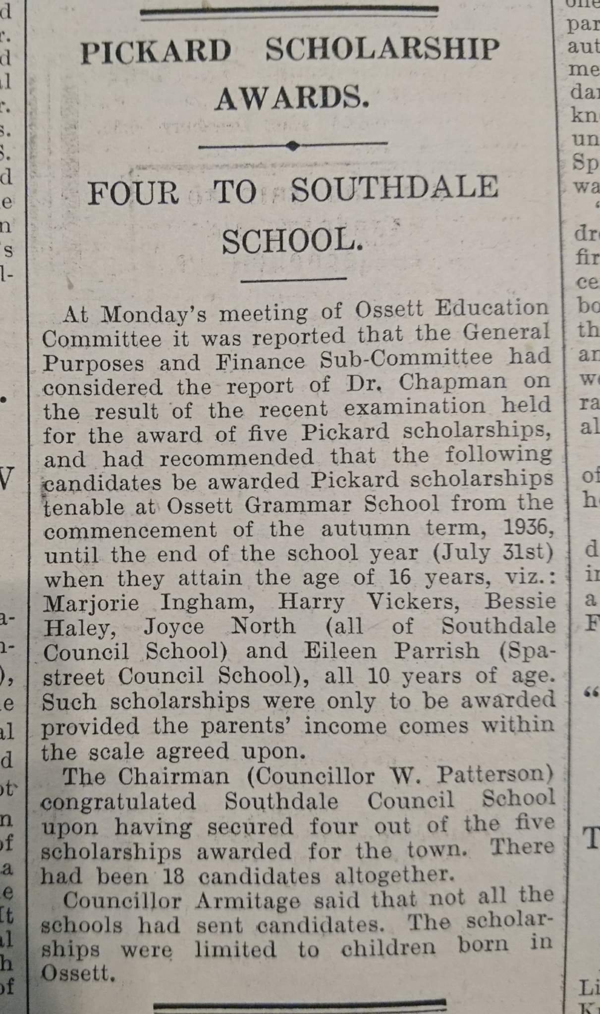 When Hannah Pickard died in 1891 she left the Grammar School provision for two scholarships, totalling £4,200 (around £344,607 today), for the education of boys from Ossett. Here are some of the scholarship recipients from 1936.