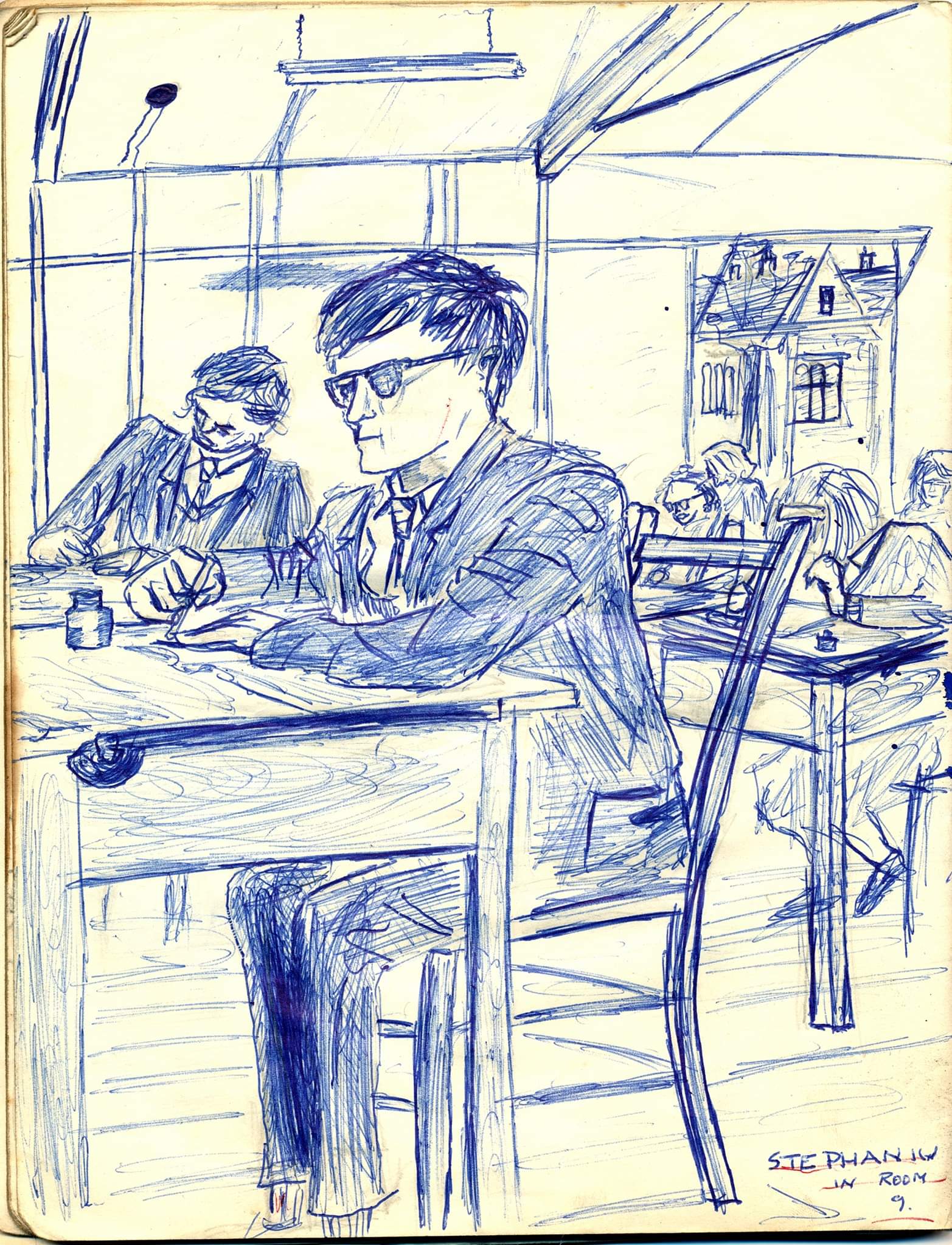 Left: I was in Mr McGrady’s class out in the hut at the edge of the playing field in the previous year, but then it was 3A, the middle class between Upper 3 and 3B. Mr McGrady’s beard was rather unusual and someone pinned a photograph of Harry Wheatcroft, the abundantly moustachioed rose grower on the classroom wall. He also bore a resemblance to the composer Mendelssohn, which was appropriate: he was the music teacher and his room was as far a possible away from the rest of the school, overlooking the cricket square and playing field. The hut was rather basic and I remember a drawing class in the adjoining classroom in the hut being interrupted briefly when a girl spotted a rat running along the heating pipes and disappearing into the wall cavity. Someone scratched ‘Hut 29’ into the paintwork by the door, a reference to the popular ITV series ‘The Army Game’, starring, amongst others, Alfie Bass as ‘Bootsie’ and Bill Fraser as Sergeant Major Snudge. My drawing shows my friend Derek Stefaniw in the hut with Irwin Freeth in the background. And that’s Park House visible through the window.