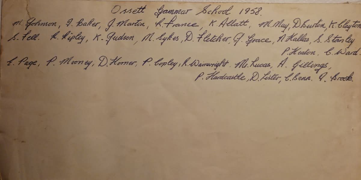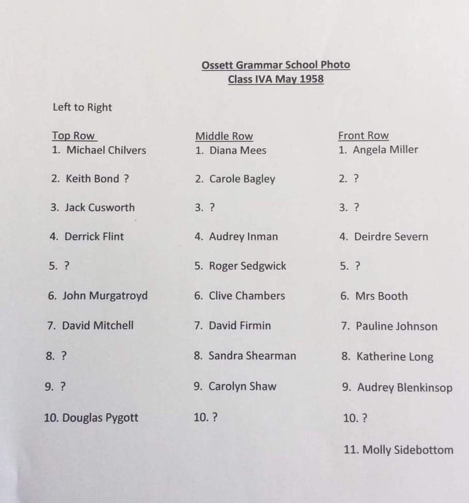 Above. Angela Pryce née Miller: “I attended Ossett Grammar School from 1955 to 1960: I have a very battered class photo from 1958. Class 4A, our Form Teacher was Mrs Booth. I am on the front row, first left.”