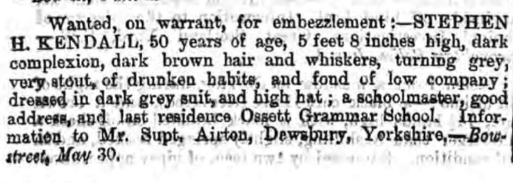 In 1881 Stephen was wanted on warrant for embezzlement of the Wakefield & Barnsley Banking Co. (Ossett’s first bank, which subsequently became Barclays.) Apparently he’d gone away with a lady and wasn’t expected to return. He had left household furniture to the value of £100 and also shares in The Halifax Building Society. I can find no evidence to suggest that he was ever caught!