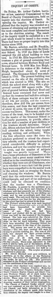 In 1895 the Royal Commission of Education instructed a number of Assistant Commissioners to report on the condition of secondary schools around the country. The report on Ossett Grammar School wasn’t particularly favourable … Ossett was described as ‘a small manufacturing town devoted to the sorting and preparation of rags for the making of mungo’. It was said to be a ‘mean looking town‘ with no large mills but many small factories.