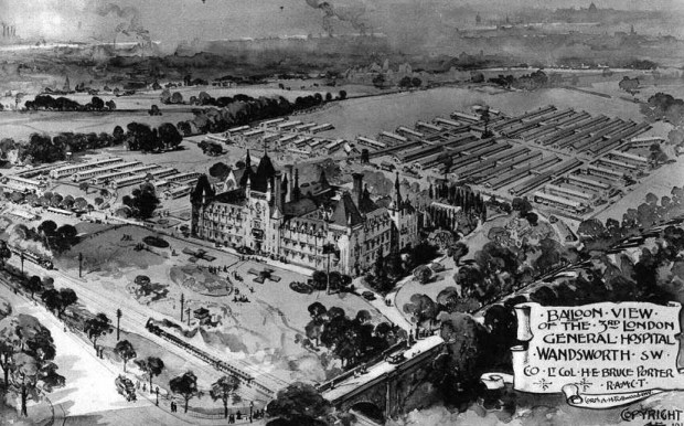 This postcard shows a balloon view of the 3rd London General Hospital, Wandsworth. The railway lines which delivered wounded troops can be seen to the south, the overflow tent-wards towards the north.