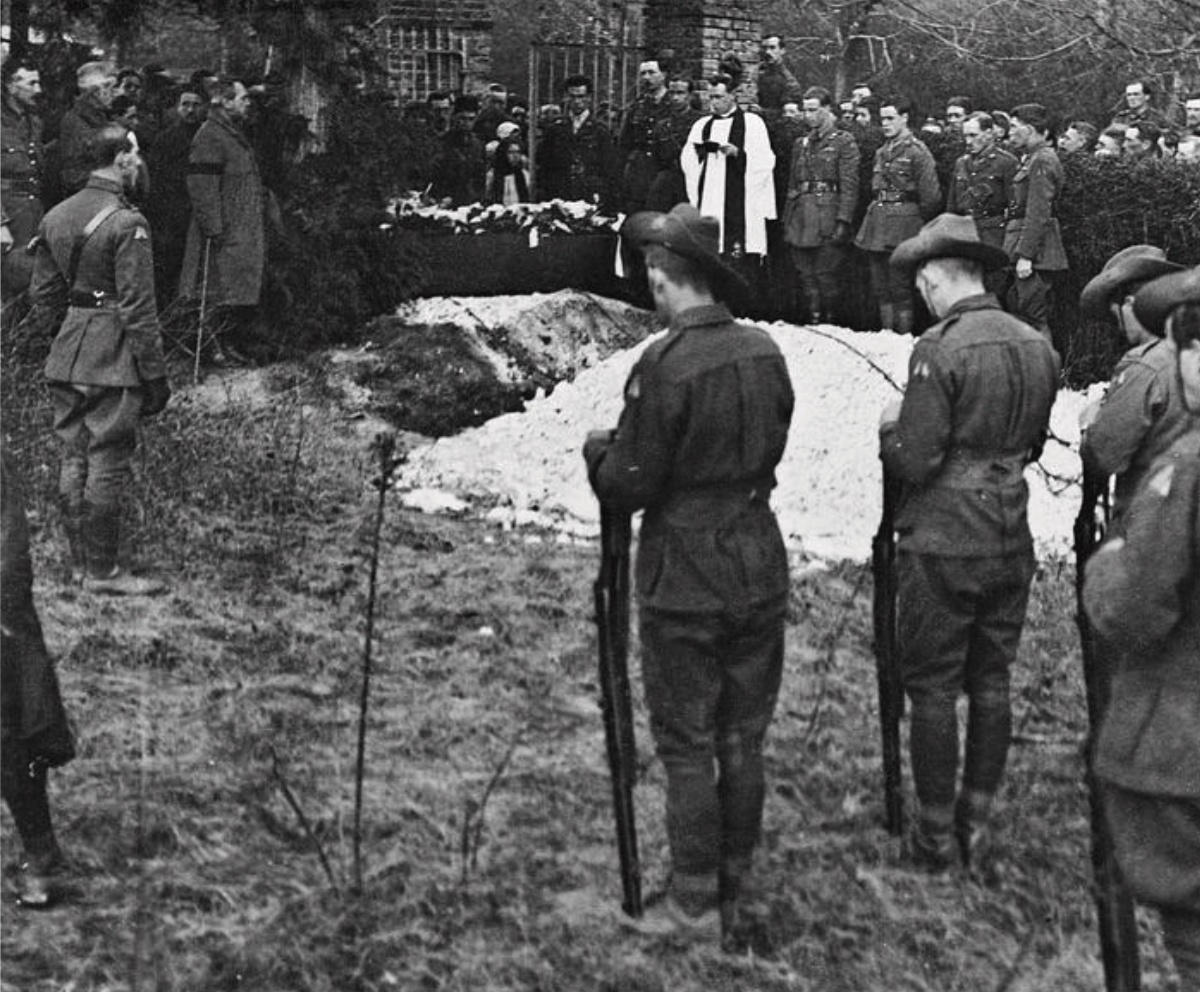 A crowd of soldiers and several townspeople gathered around as a eulogy was given by George, and then the coffin was lowered into the grave.