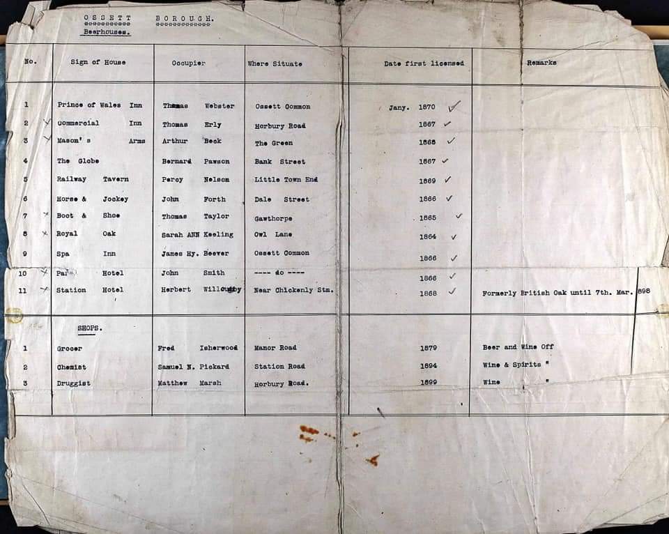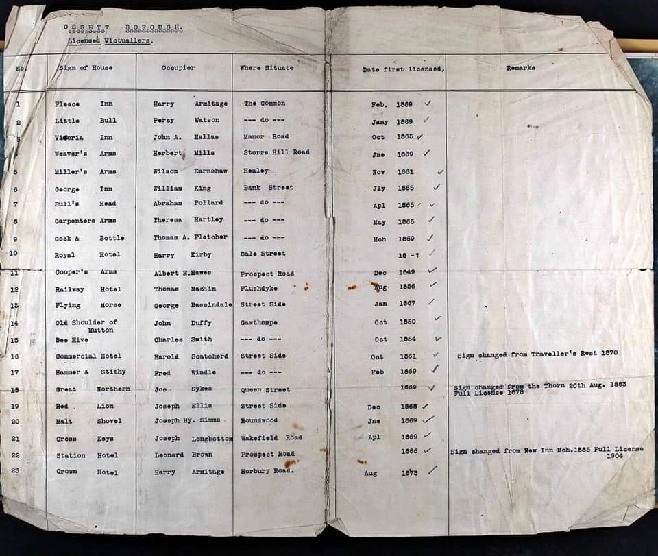 26 Aug 1869 Dewsbury Brewster Sessions. At the above Sessions held at the West Riding Police Court, Dewsbury on Tuesday last, all the licences for Ossett, both beer and spirits, were renewed with the exception of Henry Smith’s, William Ayliffe’s and Rufus Goodare’s, the latter being deferred to the adjourned Brewster Sessions on Sept. 27th.