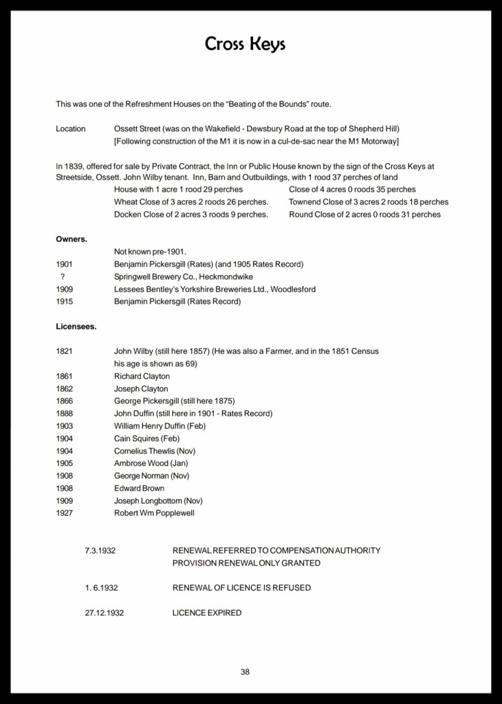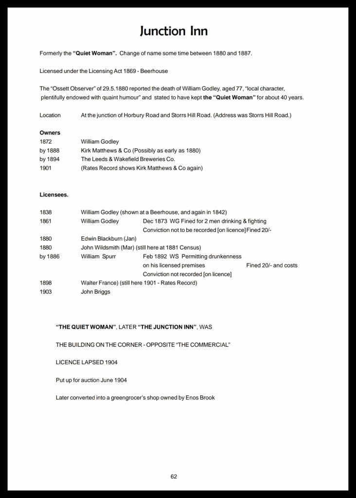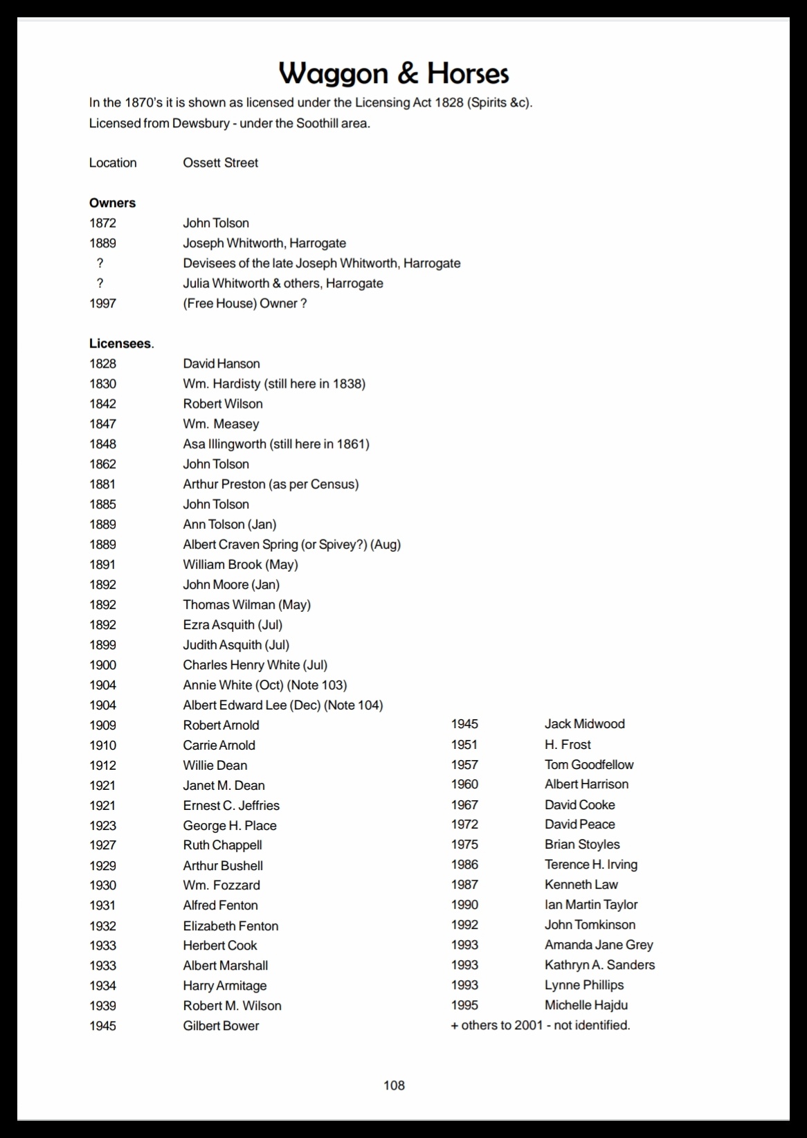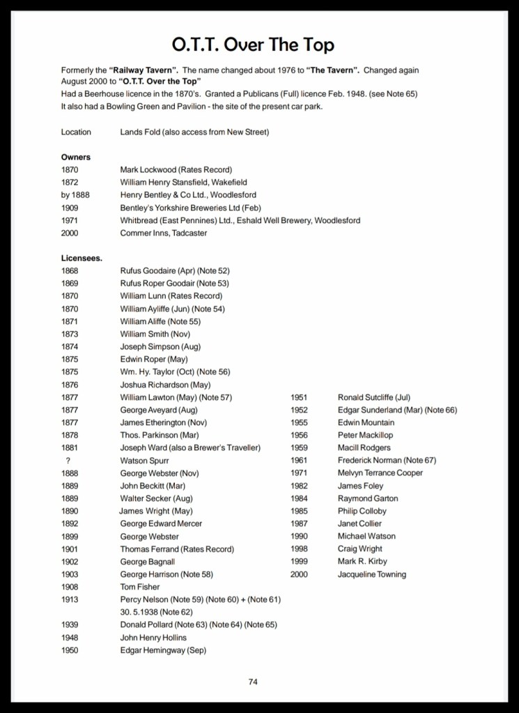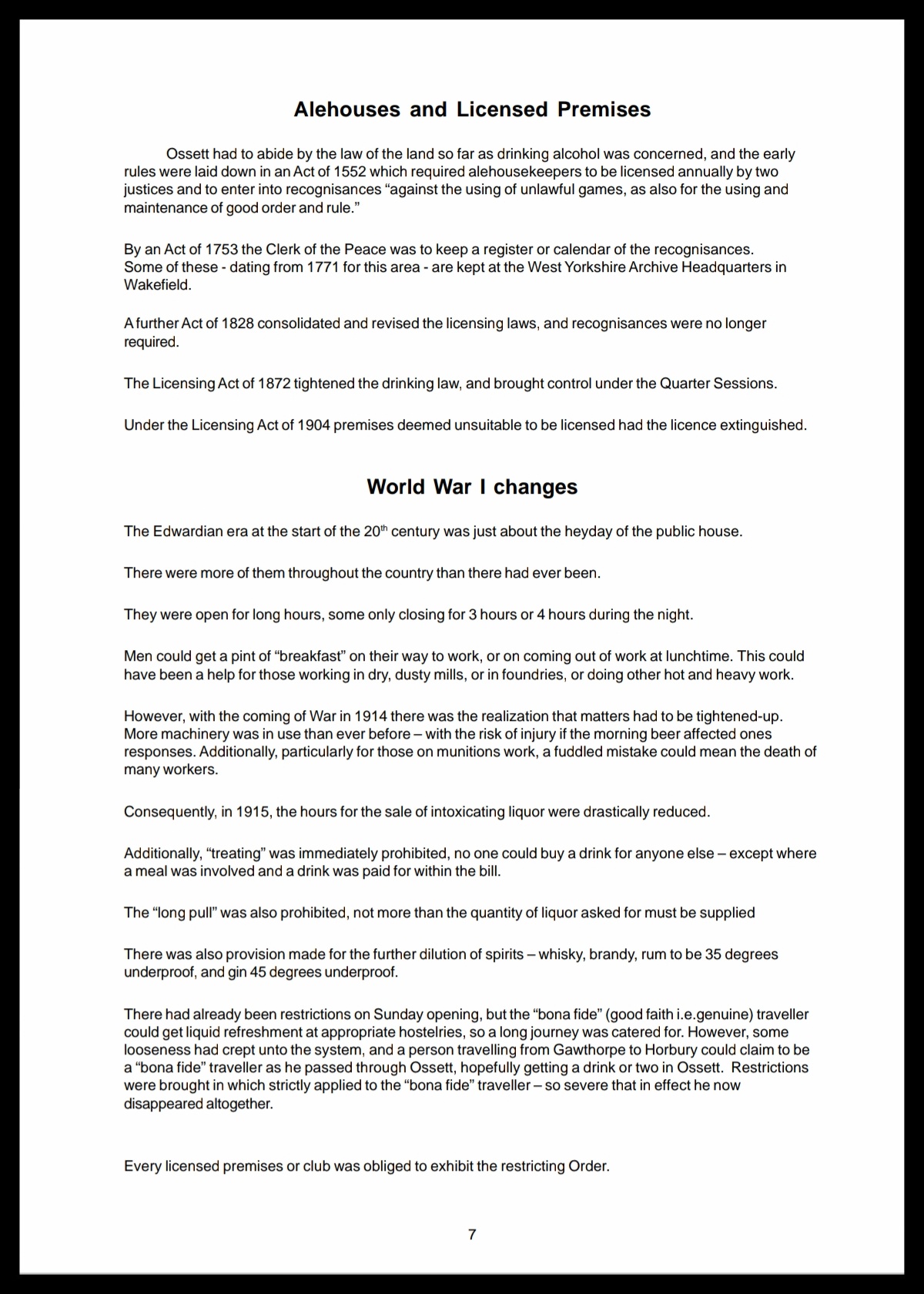 There had already been restrictions on Sunday opening, but the “bona fide” (good faith i.e.genuine) traveller could get liquid refreshment at appropriate hostelries, so a long journey was catered for. However, some looseness had crept unto the system, and a person travelling from Gawthorpe to Horbury could claim to be a “bona fide” traveller as he passed through Ossett, hopefully getting a drink or two in Ossett. Restrictions were brought in which strictly applied to the “bona fide” traveller – so severe that in effect he now disappeared altogether.