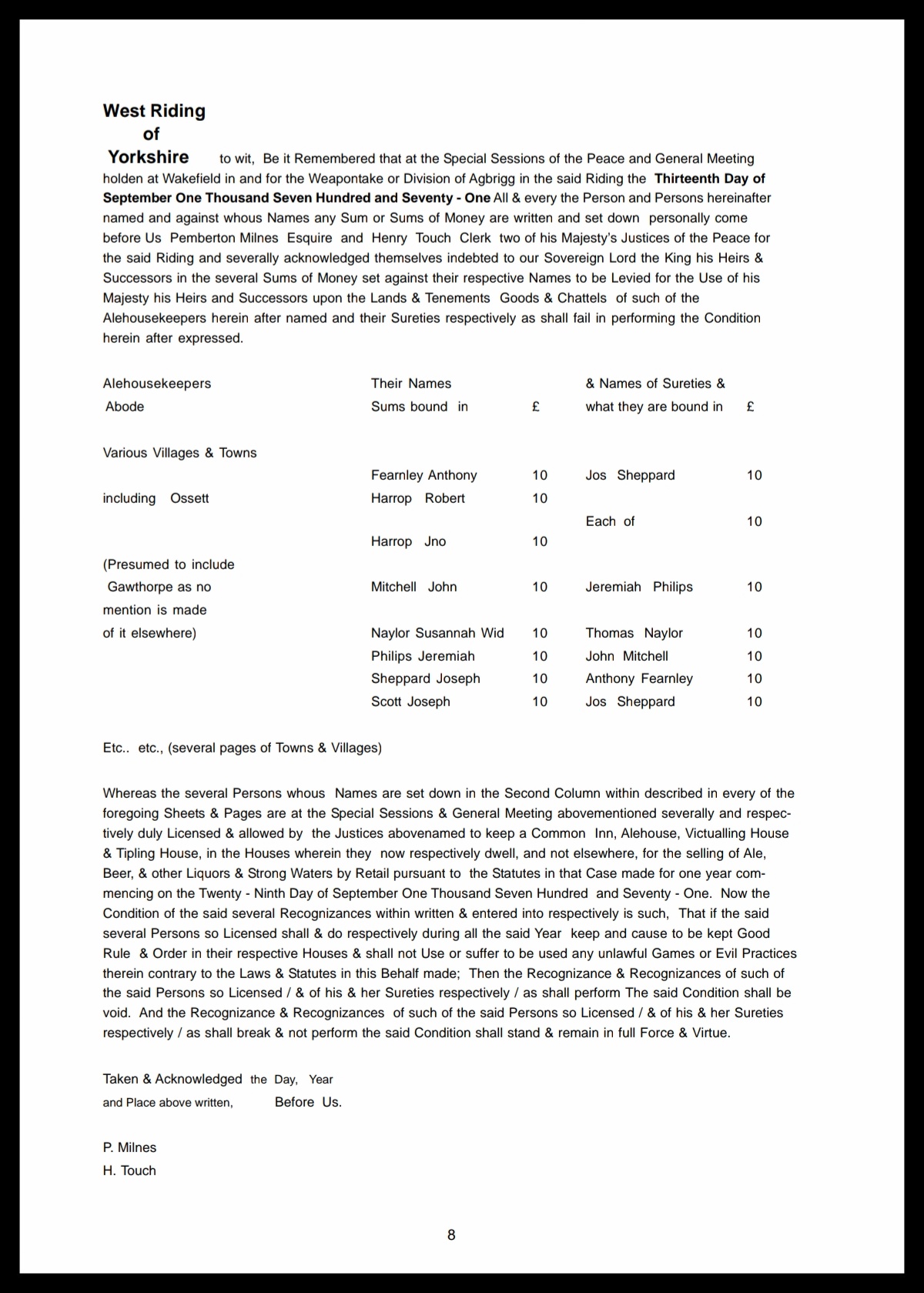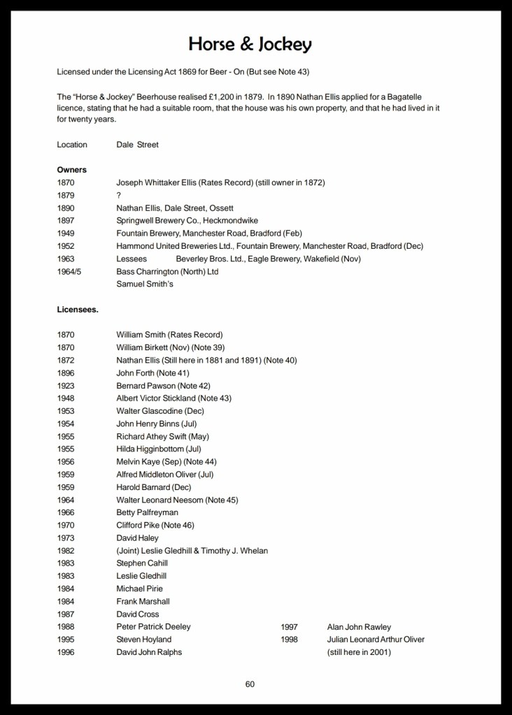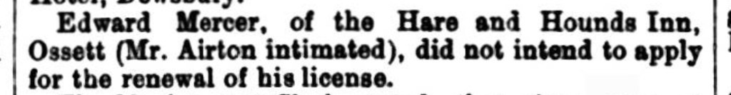 3 Dec 1870 William Birkett, Ossett, summoned for permitting drunkenness in his house, the Horse & Jockey, on the 28th ultimo. &c.