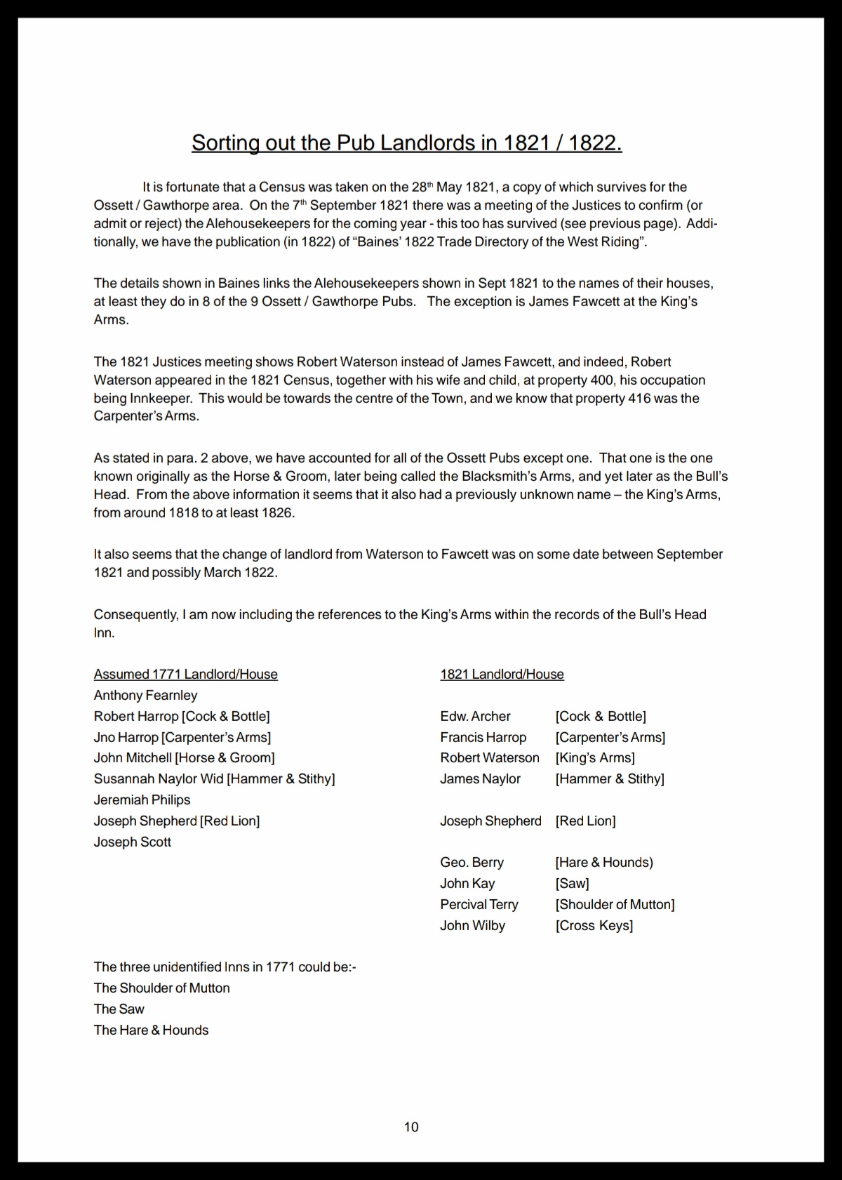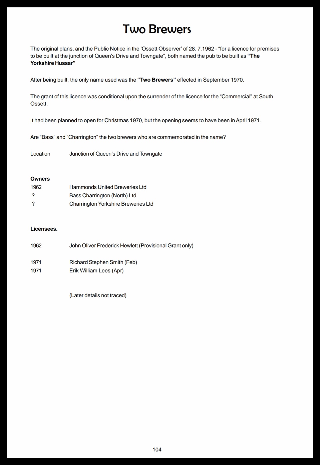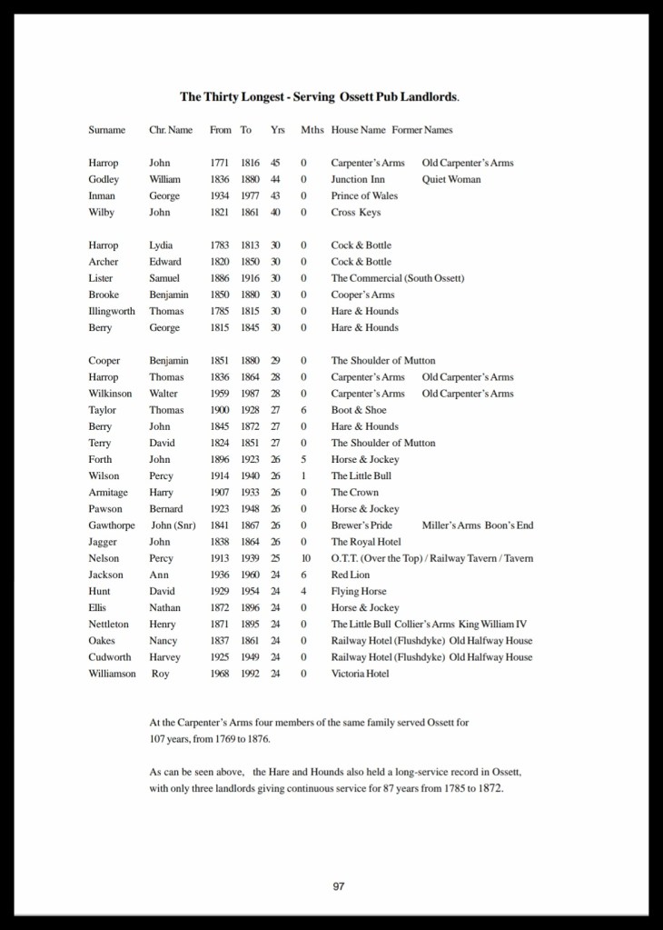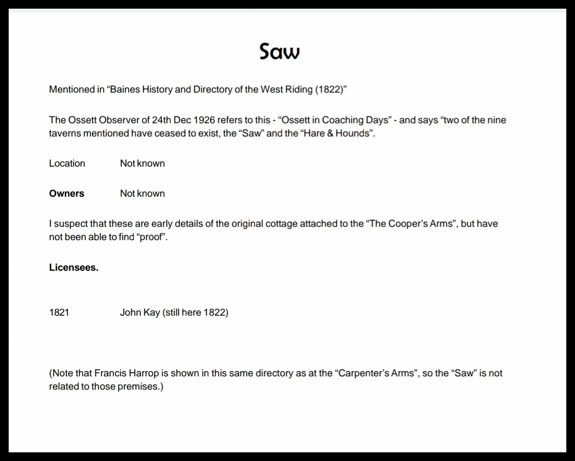 Whilst “home brew” could continue to be made untaxed, the government found that it could raise funds by licensing certain premises for the production and sale of beer, together with the sale of food, and some of the earliest pubs in Ossett had brew-houses within their premises. Licenced Victuallers only could sell this beer and food. The “Carpenter’s Arms” (1768) and the “Cock and Bottle” (1771) were in the right position for early development, being close to the Church, whilst nearby in Little Townend another old pub was the “Cooper’s Arms” (1818, or a bit earlier). Good food was provided, the various premises becoming food and drink meeting places for the conduct of business, inquests, parties, and the development of Ossett when the Local Board had to use various pub premises for its meetings.