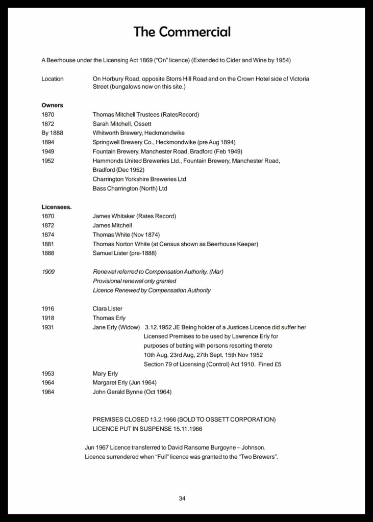THE BEER AND WINE LICENSES. The applications for beerhouse licences were taken after the Licensed Victuallers’ “Black List,” had been disposed of, and the following persons had certificates granted them in Ossett : Jos. Nightingale, Spa Inn, Spa; Joseph Burton, .Park Hotel, South Ossett; John Briggs, Royal Hotel, Owl-lane; Wm. Godley, Quiet Woman, South Ossett; John Ingleman, Boot and Shoe, Gawthorpe ; Joseph Farrar, Masons’ Arms, Green; George Pawson, New Inn, New-street; Benjamin Illingworth, Globe Inn, Dale-street; James Whitaker, Commercial Inn, South Ossett ; Mary Fligg, The Thorn, Rosemary-lane; William Smith, Horse and Jockey, Dale-street ; James Fothergill, Prince of Wales, Common ; Robt. Cottam, shopkeeper, Dale-street ; Samuel Stringer, British Oak, Chickenley Heath.