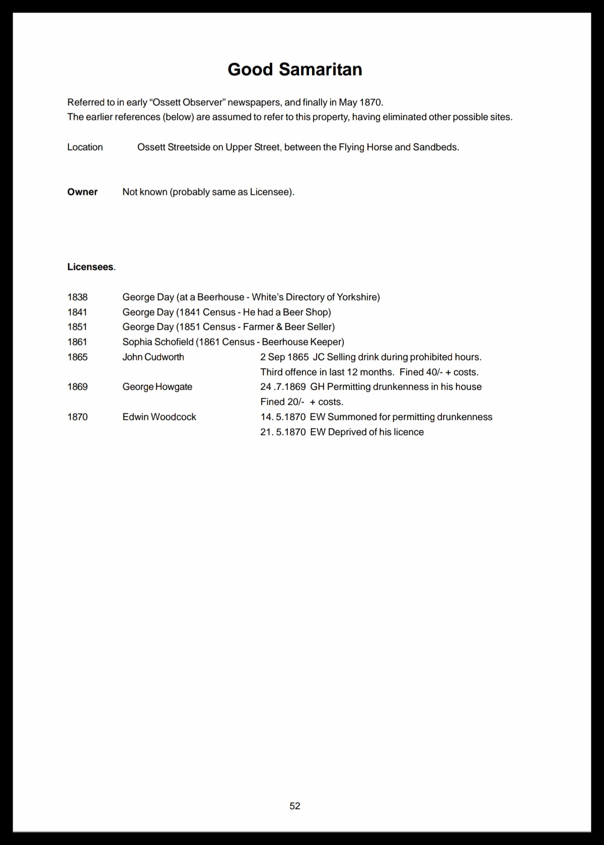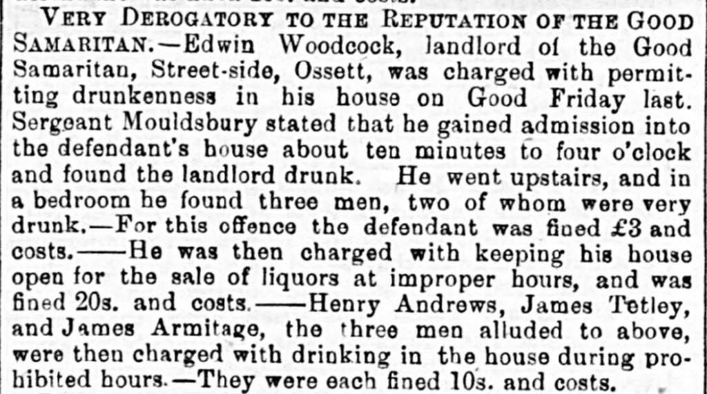 23rd April 1870 Ossett landlords beware. Edwin Woodcock, keeper of the Good Samaritan Inn, Ossett Streetside, was charged with violating the law. &c.