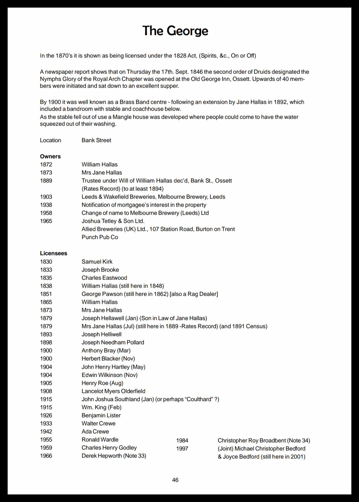 21 Apr 1871 Nymph Lodge 34 Druids had its annual dinner on Easter Monday at the George Inn, Ossett. It was provided by the landlord, Mr William Hallas, in a most ample manner which gave every satisfaction. &c.