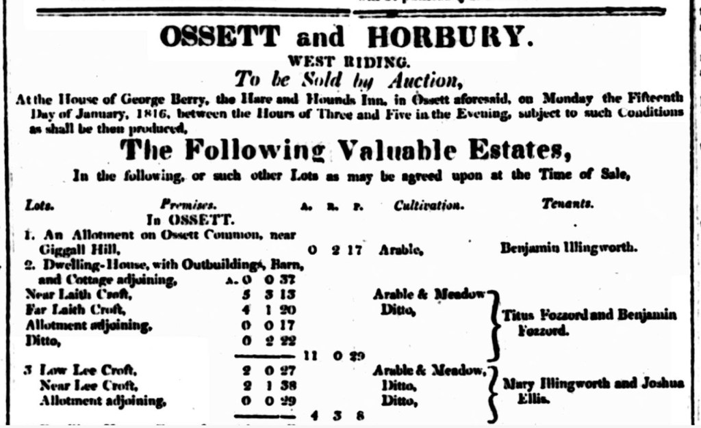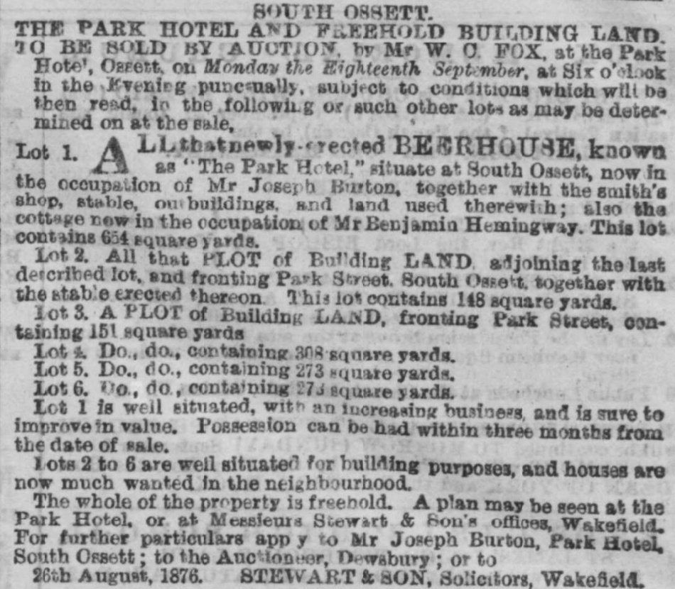 2 Nov 1867 Sale of valuable estate at Ossett, came under the hammer at the Cooper’s Arms.