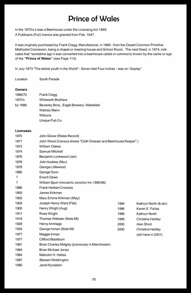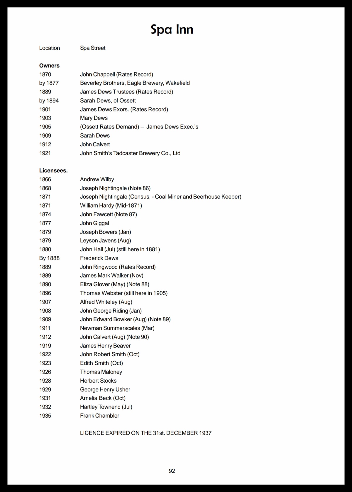7 Jun 1868 A caution to unruly tiplers. On Monday last, at the Dewsbury Police Court, William Batley and Frank Thurlow were charged at the instance of Joseph Nightingale, landlord of the Spa Inn, Ossett, with being drunk and refusing to leave his house when required to do so on the 22nd May last. Batley was acquitted but Thurlow was fined 10/- plus costs.