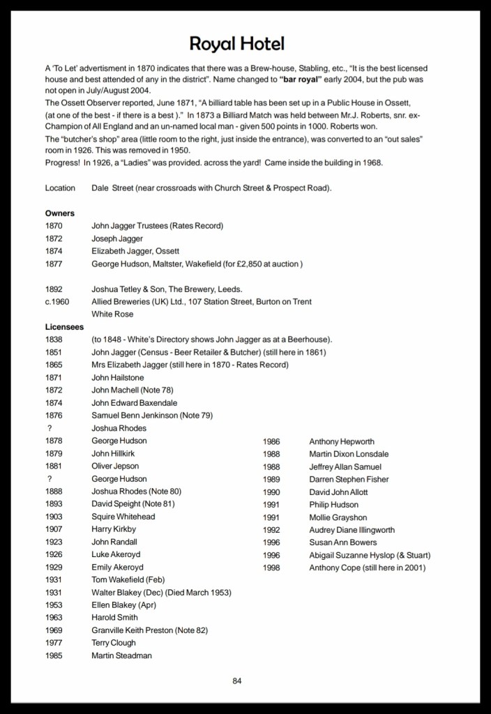 23rd April 1870 Ossett Lodge Festival. The members of the Grand United Order of Oddfellows of Apollo Lodge No. 83, met on Easter Monday at Mrs Jagger’s, the Royal Hotel Inn, Ossett, to celebrate their 47th anniversary, when about 100 members sat down for an excellent dinner provided by the worthy hostess. &c.