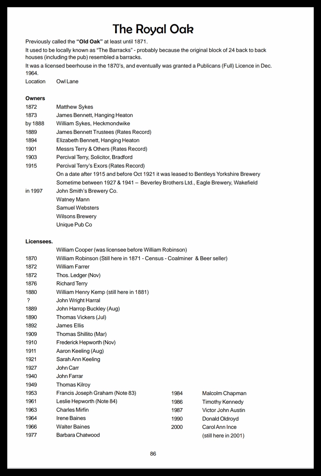 18 Jun 1870 Transfer of Licence. William Robinson applied to the West Riding magistrates at Dewsbury on Monday last for a transfer of a licence for a beerhouse in Owl Lane, Ossett, recently kept by William Cooper. Application – granted. [Note – “Royal Oak”].