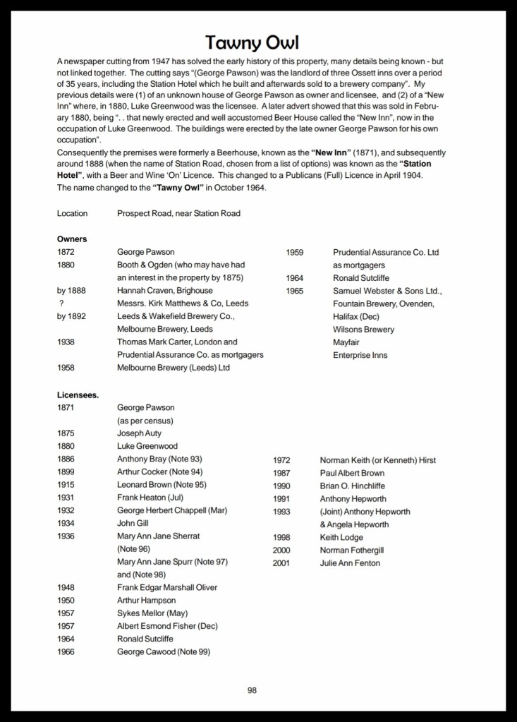 The name George Pawson first appears in the records of The Bull’s Head (Town), (“Town” being the former name of Bank Street), as the licensee from 1842 to 1850. On the 1851 Census it shows that he was born at Mirfield and is aged 37. His wife Elizabeth aged 34 was born in Ossett and they have two children living with them, Sarah 14, and Emma 6. Their son, Thomas, was a visitor staying with his grandmother Sarah Illingworth, widow, aged 61, a rag sorter, living at Town. From 1853 Mrs Illingworth was known to be the proprietor of a beerhouse called The Globe (Town), on the opposite side to the Bull’s Head. In the 1861 Census she was aged 71 years and when she retired in 1867 she would be 77. By 1851 George Pawson had moved from the Bull’s Head to take over The George (Town) and remained there until 1854. In the 1853 White’s Trade Directory he is listed as a Rag Dealer and Publican. In the 1861 Census his family had increased and there was now Thomas (22), Emma (16), Mary Elizabeth (9), John D (6) and Benjamin (2). In the 1861 Kelly’s Trade Directory Thomas is listed as a Rag Dealer. As shown in the 1871 Census the family has moved to TheNew Inn on Back Lane (subsequently Prospect Road) and only John and Benjamin remain at home. George Pawson had built this Inn, but Station Road was not to be developed until 1888. Vehicular access to the railway station was via New Street, and the New Inn was hoping to attract trade from this source. Perhaps initially the trade did not come up to expectations, and his wife is working as a Cloth Burler. Son Thomas is a lodger at the Hare & Hounds. By 1881 both George and his wife are dead. Thomas Pawson (42) had been widowed and is living in Jubb’s Yard (to the rear of the New Inn), and is a General Dealer. With him is Benjamin (22) who is a General Carrier. In 1891 Thomas is a Wagonette Proprietor living at Quarry House, Leeds Road End (Gawthorpe), with his nephews and nieces, the Wilson’s. Benjamin (32) has married Mary (31) and they have 5 children, George William (7), Bernard (5), Lillian (3), Roland (2) and Clara (1).