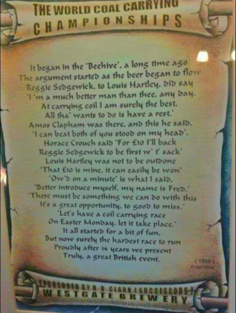 While Lewis digested the implications of this challenge Fred Hirst, Secretary of the Gawthorpe Maypole Committee ( and not a man to let a good idea go to waste) raised a cautioning hand. ” ‘Owd on a minute,’’ said Fred – and there was something in his voice that made them all listen. ‘Aven’t we been looking fer some’at to do on Easter Monday? If we’re gonna ‘ave a race let’s ‘ave it then. Let’s ‘ave a coil race from Barracks t’ Maypole.’’( The Barracks being the more common name given by the locals to The Royal Oak Public House )Thus was born The World Coal Carrying Championships!