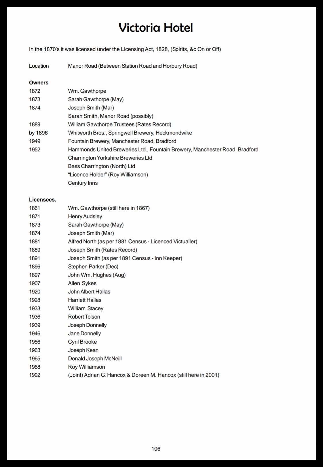At Healey there was a large mill complex which utilised the water power available from the River Calder. After weaving, the woollen cloth had to be “fulled” or “milled”. This entailed pounding the wet cloth with water powered wooden hammers, a skilled job. The cloth was then attached to tenter frames by tenter- hooks. Suspended on these frames the cloth dried and shrinkage was controlled. John Gawthorp, a Cloth Miller, born at Horbury Bridge, moved to Healey in the early-1840’s with his wife and 4 children, and took over a beerhouse (Miller’s Arms). The 1851 census lists John Gawthorp (40), Sarah (39), born at Healey, John (20), William (17), Sarah (15), Ann (12), Joseph (8), Caroline (5), Squire (2) and Catherine (1 month). On the 1861 census John Gawthorpe is shown as an Innkeeper (Miller’s Arms), whilst his son John is a Cloth Fuller employing 5 men. William has become the licensee of the Victoria Hotel in Manor Road. In 1871 John Snr is back as a Cloth Fuller and John Jnr has taken over the Miller’s Arms. Then in 1872 William left the Victoria and went to live in Wakefield. In 1873 John Snr died and Sarah, his widow, became both the owner and licensee of the Victoria, but only for one year. In the 1881 census Sarah is living in Greatfield Road with John Henry (15), her grandson, a solicitor’s clerk. By 1877 John Jnr had died and his widow, Jane Gawthorpe, had taken the license of the Miller’s Arms. This Inn was subsequently sold in 1881, and John Duffin became the licensee.