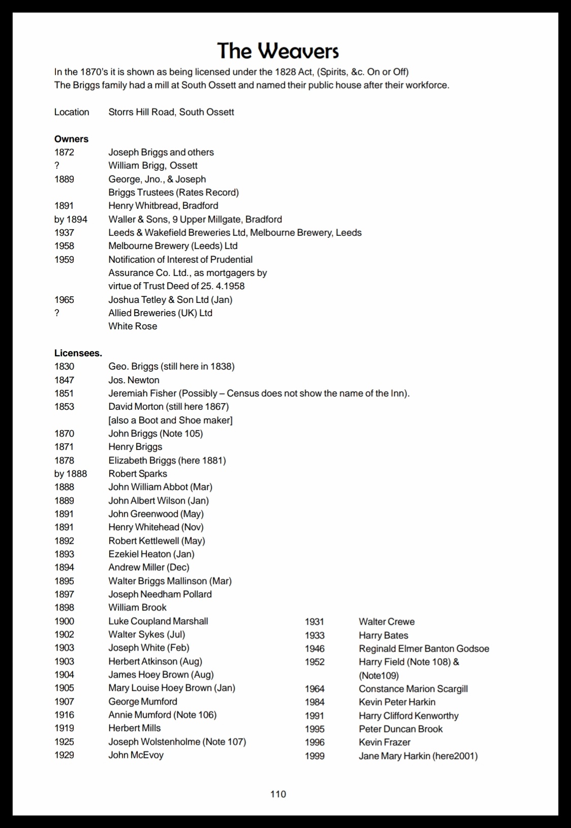 8 July 1871 At the Dewsbury West Riding Police Court yesterday, Henry Briggs, the landlord of the Weaver’s Arms, was indicted by P.C. Rogers for permitting drunkenness in his house on the first instant. Defendant pleaded guilty and as he was consid ered to have kept a respectable house, he was discharged on payment of costs.