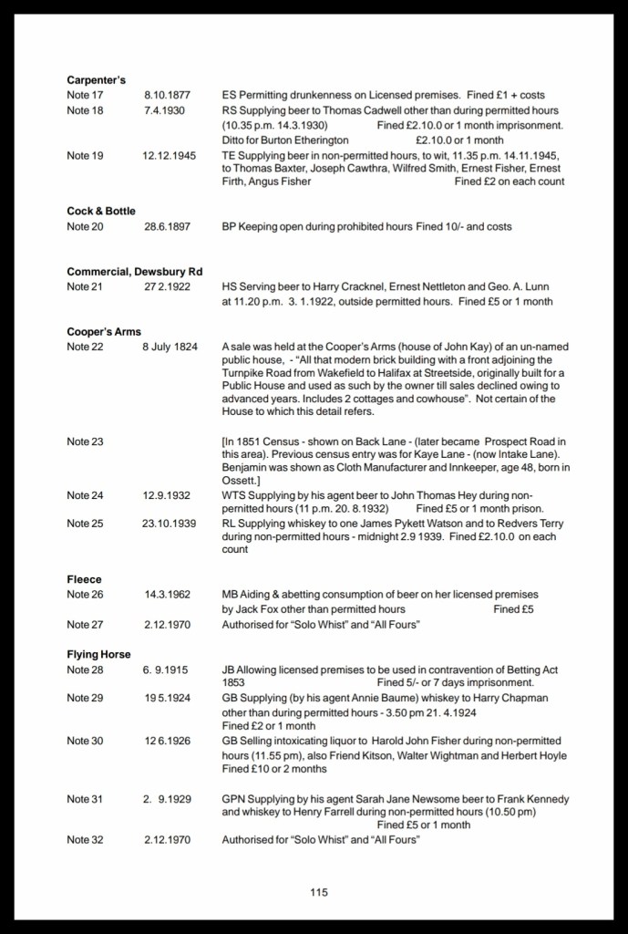1 Nov 1868 Permitting Sunday drinking at Ossett. Mr Benjamin Fothergill, Ossett Common, was charged yesterday at the Dewsbury Police-court with having his house open on Sunday last against the tenor of his licence. P.C. Fiddler gave the information. He said that he visited the house on the day in question and found four men present with glasses of ale before them. Defendant stated that they had come to pay him for some potatoes and he had given them the ale. In consideration of having kept a house for 18 years, and not being before the Bench in the whole of that time, they only fined him 10/- and costs. [Fleece Inn].