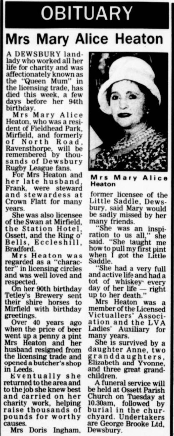 May 1939 DEATH OF MR LEONARD BROWN, OSSETT. A local Licensee, and well-known county bowler, Mr Leonard Brown of the Millers’ Arms, Healey, Ossett died on Saturday, after a lengthy illness, age 67. He was born at the Cliffe Tree Inn, Wakefield. He came to Ossett at the age of 12 when his stepfather became landlord of the Flying Horse Inn. In 1912 Mr Brown took over the Flying Horse, but in 1914 moved to the Station Hotel, Prospect Road, Ossett, where he remained until 1931. After a short period as landlord of the Robin Hood Inn, Tadcaster, he returned to Ossett, and nine months later took over the license of the Millers’ Arms, Healey, until his death.