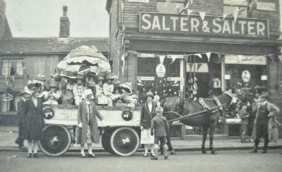 The cottages are visible in the background of an Ossett Carnival from 1920