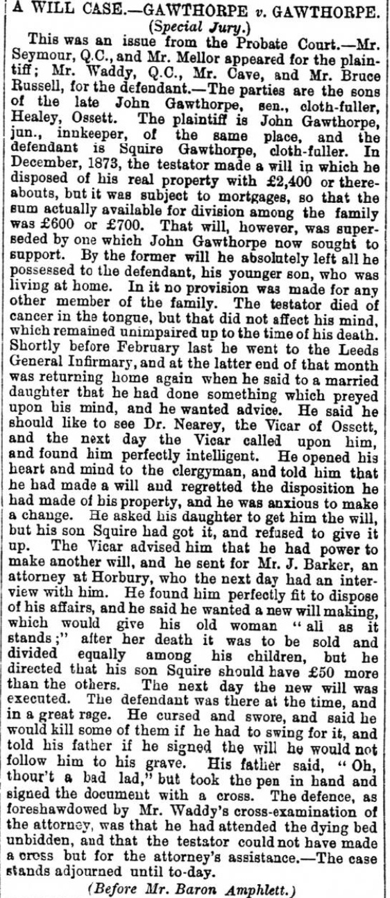 The case was resumed and a verdict was given for the plaintiff on all the issues. I can’t help wonder if Squire Gawthorpe received his extra £50! (Anne-Marie)