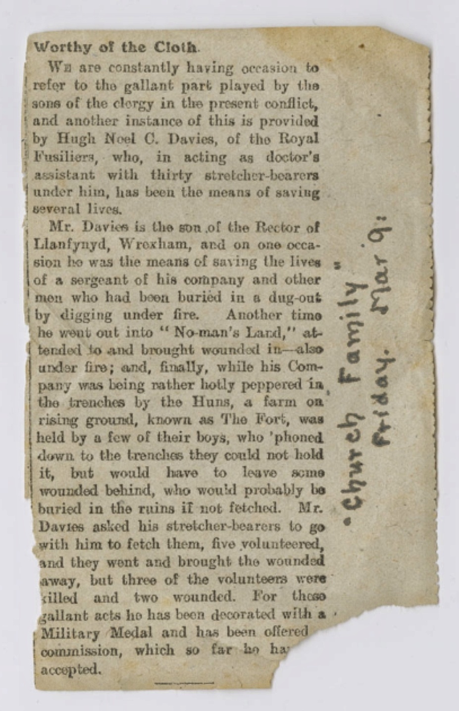 Hugh, who was known as Noel, was born in Llanfynydd, Flintshire in December 1892. Noel’s father was Rev William Taliesin Davies, a clergyman from Caernarvon. Noel’s mother, 37 year old Marie, passed away eighteen months later, just a few weeks after the birth of her sixth child. Maria’s cousin, Martha Garlick, moved into The Rectory in Llanfynydd to care for the young, grieving family.
