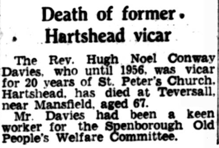 In 1956 Noel left Yorkshire when he became the Vicar of St Katherine’s in Teversal, Nottingham. He died in 1959 and is buried in the churchyard there.