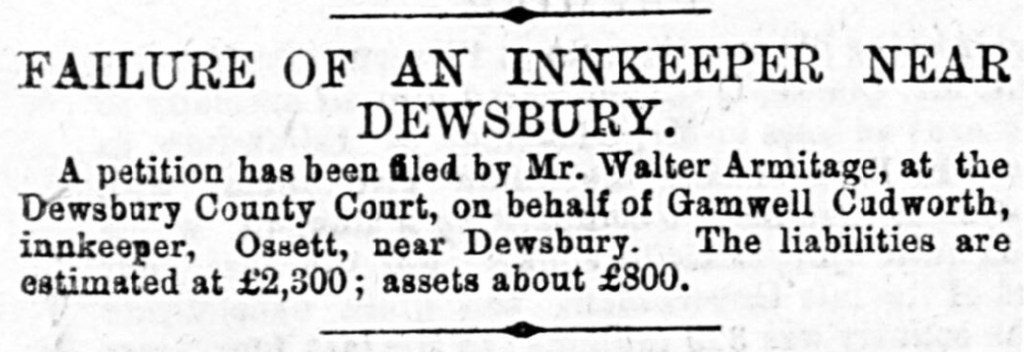 In September 1884 an announcement in the Dewsbury Chronicle and West Riding Advertiser stated that Gamwell was in debt to the tune of £2,300.