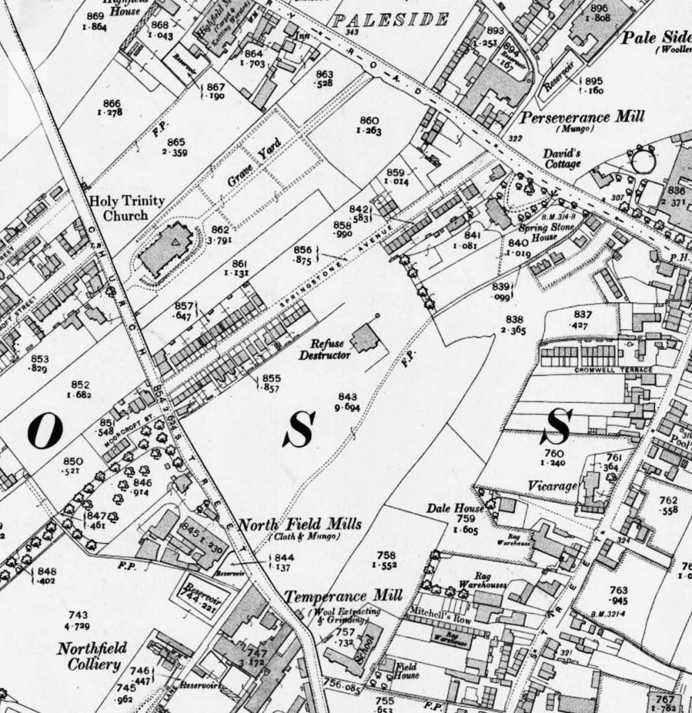 The minutes of the Sanitary Committee from December 12 1902 show that, at a cost of £1200, Ossett Corporation had bought a field in Church Street from the trustees of the estate of dyer and colliery owner William Gartside (1814-1876). He had an extensive estate that wasn’t sold off until almost 30 years after his death. The intention was to use Gartside’s field as a site for the refuse destructor and electric lighting station. The town’s refuse would be disposed of in specially constructed furnaces, and the heat that it generated would then be used to produce power to run the lighting station. Trustees of Holy Trinity School said it would be filthy and stinking, with slime laying in the roads over which children would have to cross. The area was becoming more and more residential and there was considerable opposition to the idea; a year later the council was still debating the issue.