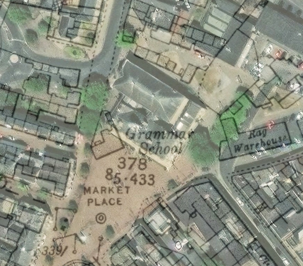 I found this particularly interesting because there are those who still maintain that the Town Hall was built on the site of the old school. By overlaying this older map (left) with a modern day one the true location soon becomes clear.