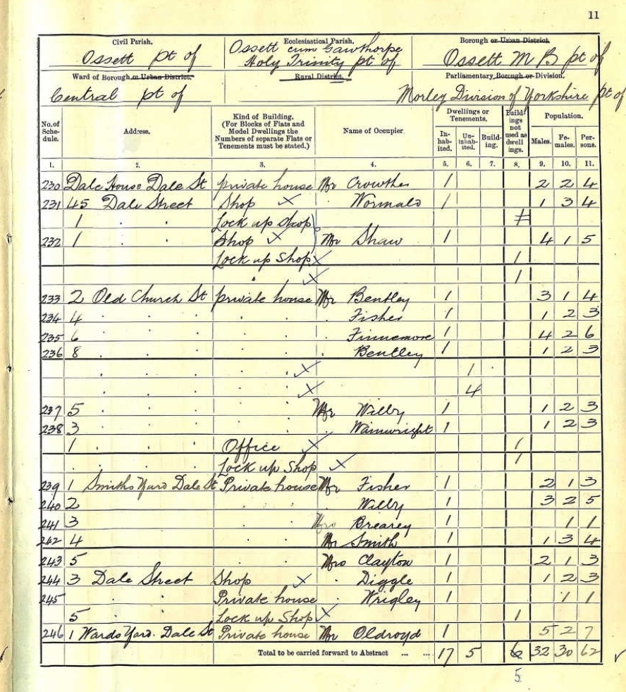 The 1911 Census Summary Books provide the name of the head of each household, and how many people were living in that household. They also reveal the type of property our ancestors were living in (such as a house, flat or shop). Ann and John William Cudworth, with their two surviving children, lived above their shop at 9 Dale Street. (We have to remember that Dale Street didn’t stop at the Co operative Store as it does now.)