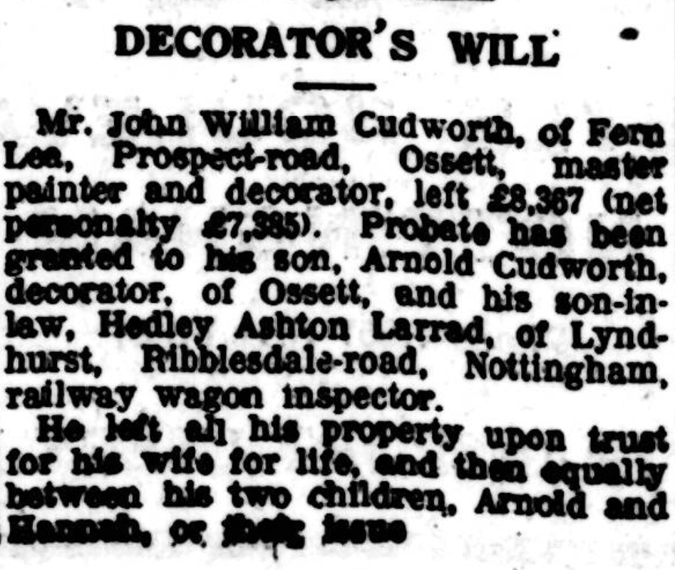 When the 1921 census was taken on June 19, the enumerator recorded that John William, Ann, and their son Arnold were still living at Dale Street, and that Arnold had joined his father in the family business. Their daughter, Hannah, left home after her marriage to engineer Hedley Ashton Larrad (1887–1962) in 1915, and they lived in Horbury before moving to Nottingham.