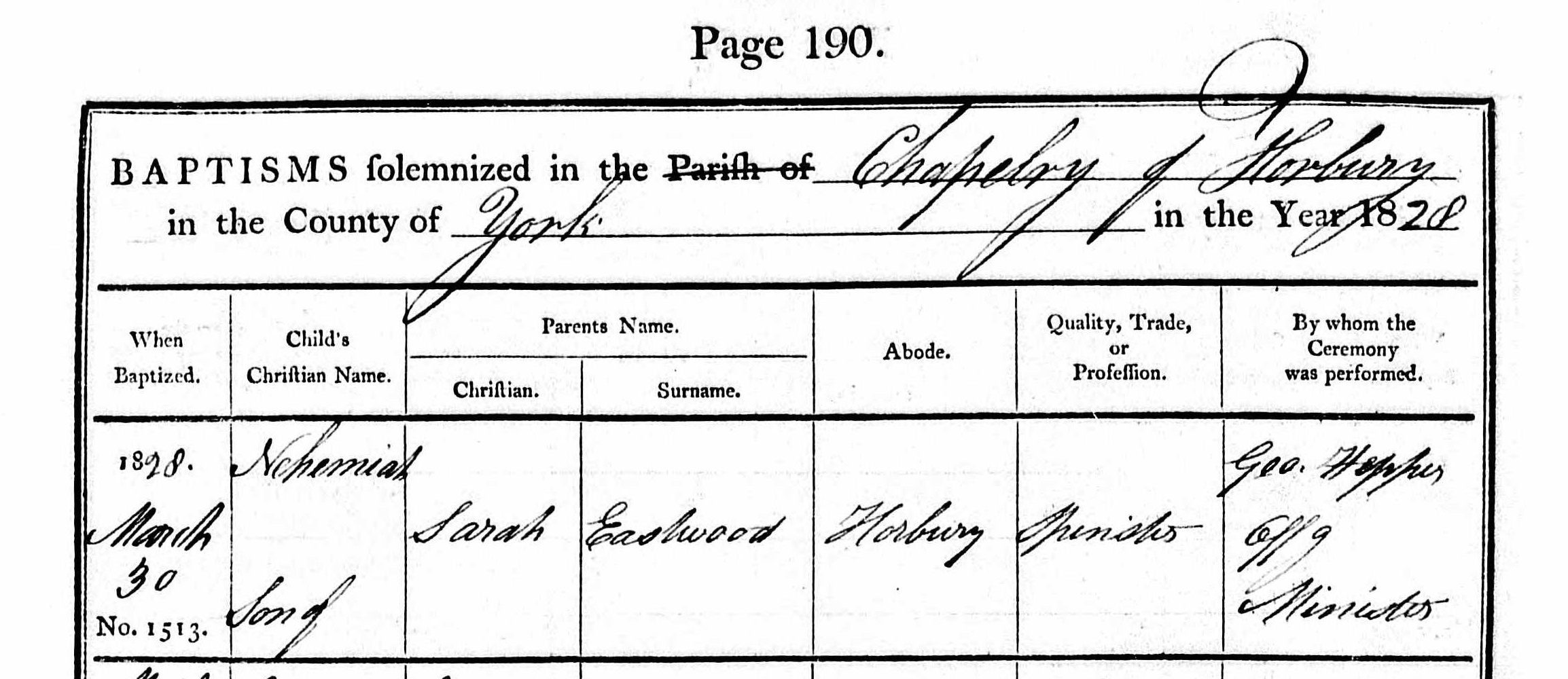 WILLIAM EASTWOOD Bapt 26/3/1826 and NEHEMIAH EASTWOOD (my Gt Gt Grandfather) Bapt 30/3/1828. Both sons of Sarah EASTWOOD Spinster