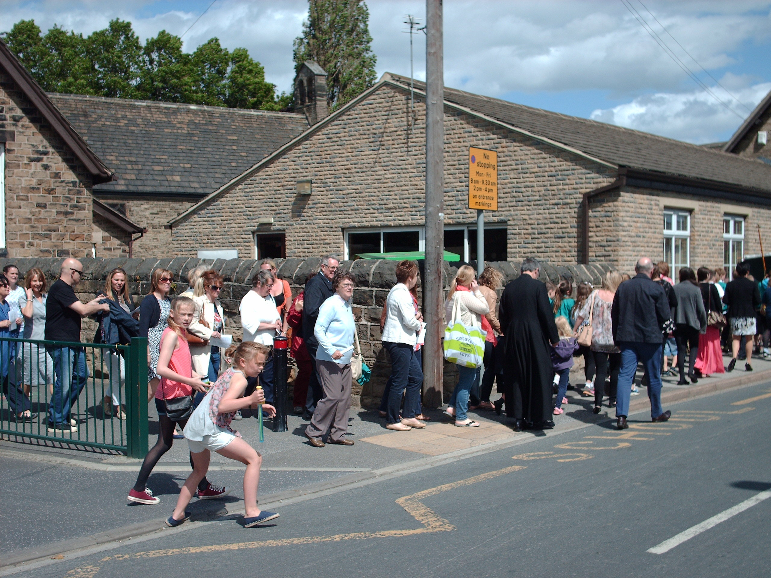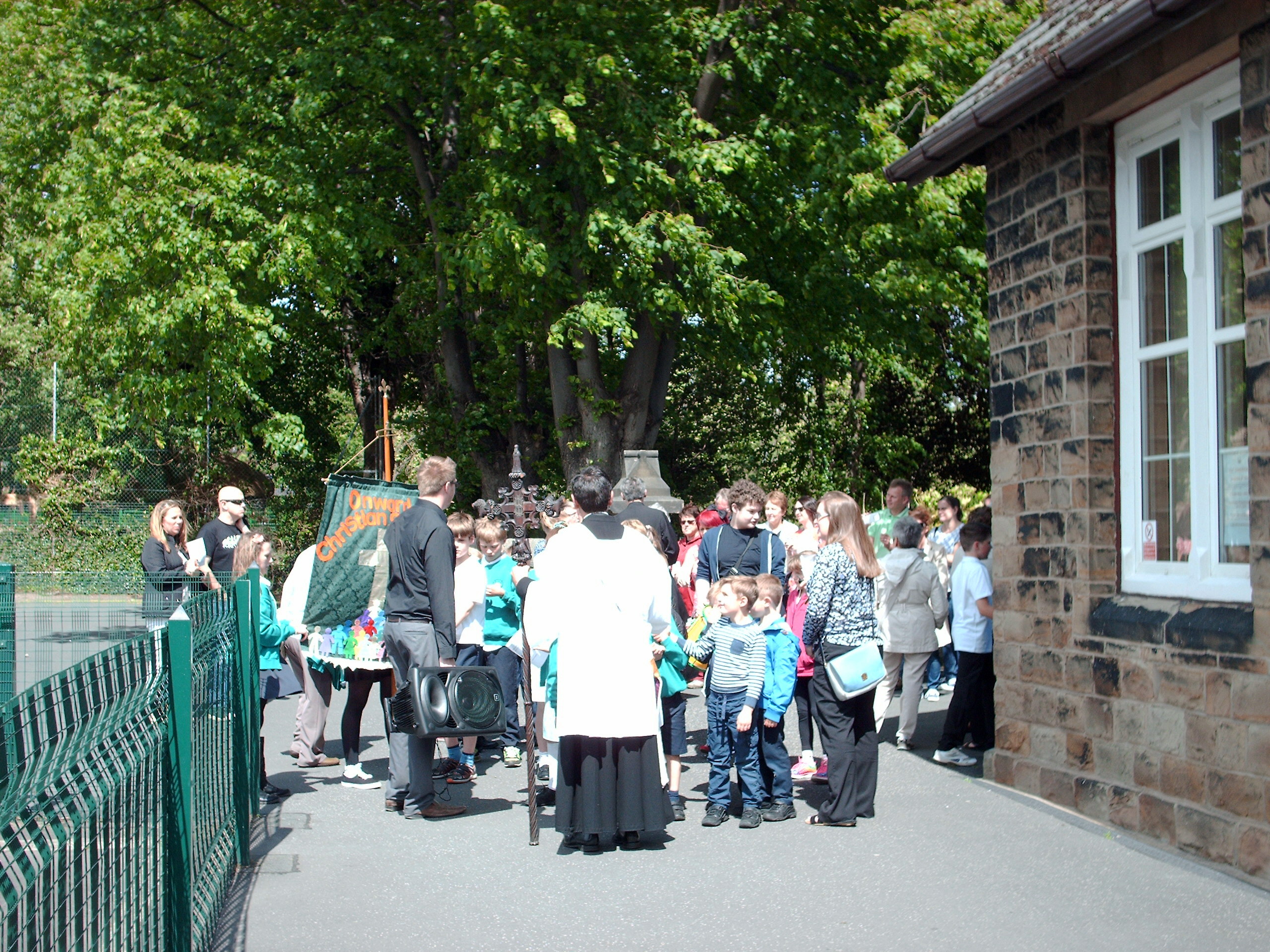 The school has changed dramatically from the small Mission Room in 1846. Now an Academy, there are many more pupils attending than when I was there. A great deal of work must have gone into the preparation for this event and much praise is deserved by Sarah Jolly and her assistants. Visitors were warmly welcomed by the staff and pupils and many displays of work and photographs were greatly enjoyed by past pupils of the school, some of which, like me, met up with people I had not seen for 70 yrs. At 2.30pm the Priest of Horbury, Father Brian and the Curate Father Andreas gathered all the children and visitors together outside St John’s Church to form a procession and re-enactment of the walk up Quarry Hill to St Peter’s took place, with Father Andreas carrying the Cross which was used in the original walk all those years ago.
