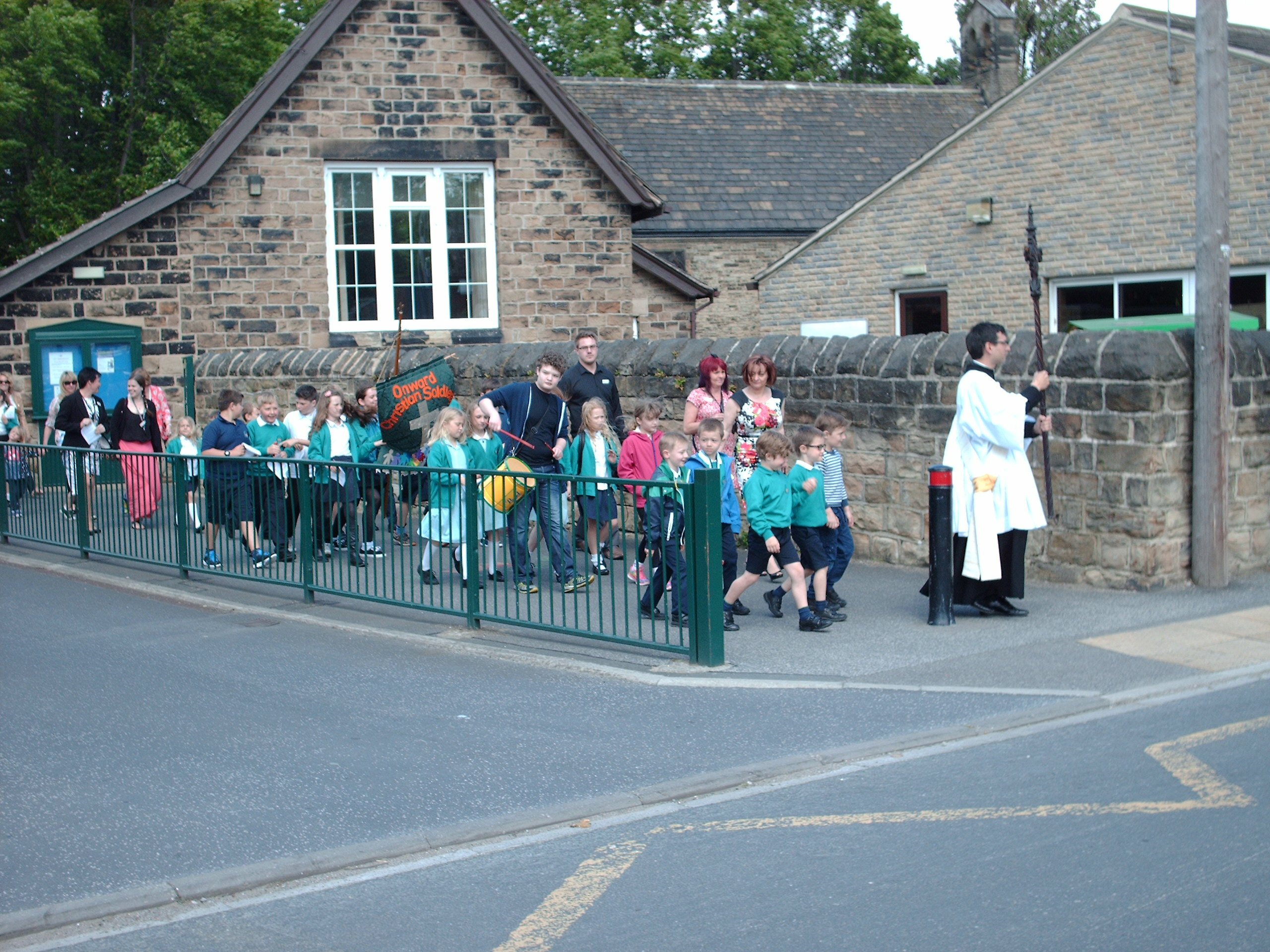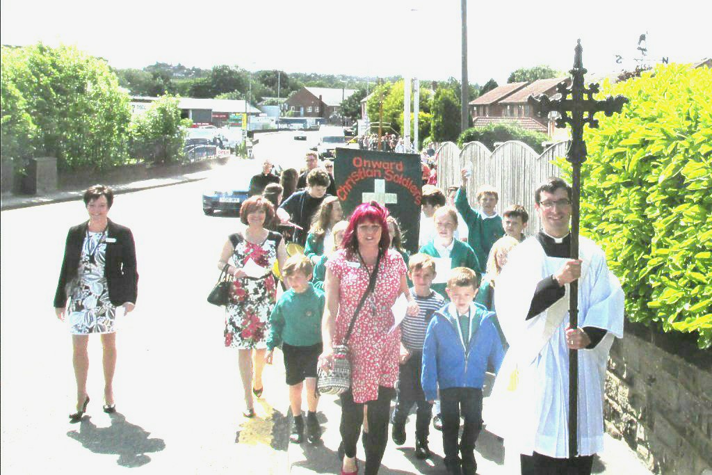 When the procession reached St Peter’s Church in Horbury a celebration service was held, starting with the Hymn “Onward Christian Soldiers”.