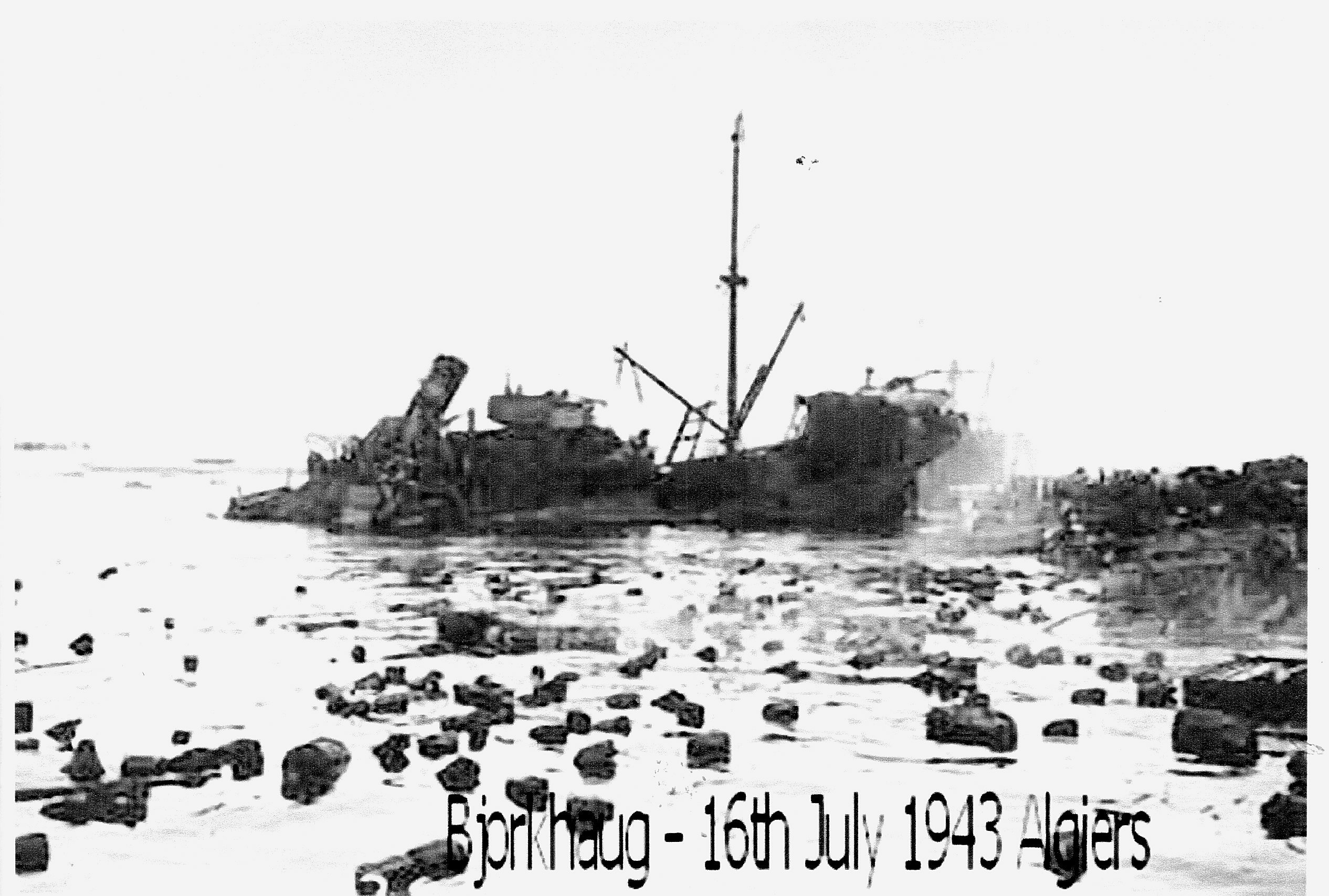 “Arthur had just celebrated his 20th birthday in Algiers where he was stationed with the Royal Engineers. On the 16th of July 1943, Arthur was in Algiers Harbour with 1031 Docks Operating Company, helping to load the Norwegian freighter “Bjorkhaug”, which was one of a convoy of ammunition ships; it was just after the Allied invasion of Sicily so the pressure to load quickly was intense.