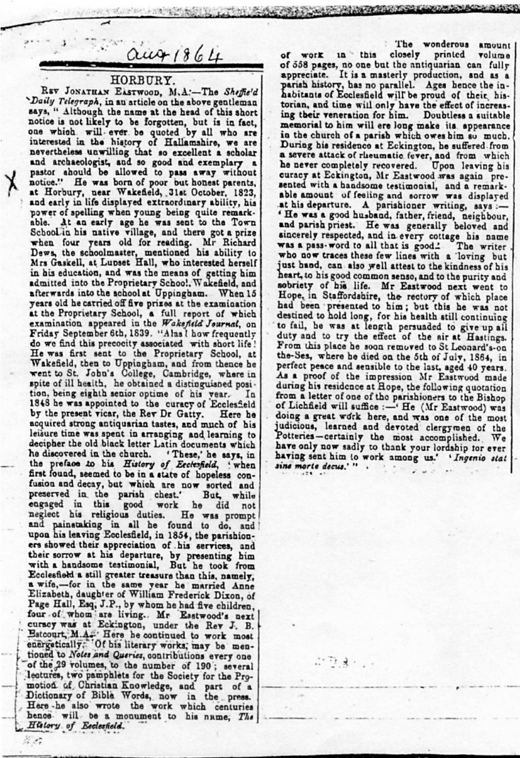General Notes: Was ordained into the C of E. Officiated at the wedding of William Eastwood & Mary Peace (in Horbury) when he was Curate of Ecclesfield. Officiated also at the wedding of Jane Eastwood.