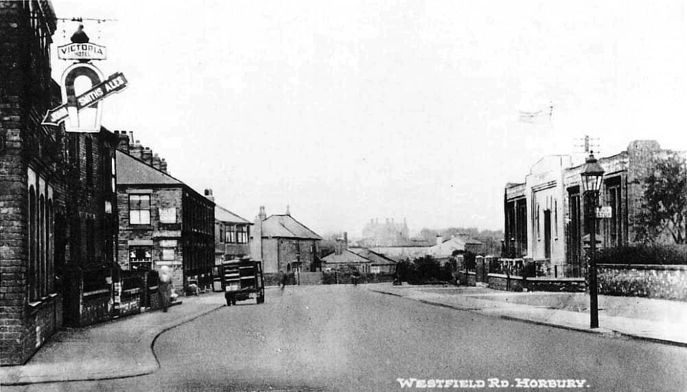 Westfield Road. On the left is the Victoria pub and on the right is William Sykes Ltd. (later Readicut). William Sykes opened his new factory in 1896, making athletic goods. The frontage in the picture was added in 1930-1. Apparently, visitors to the town mistook it for the Town Hall, it was so impressive!