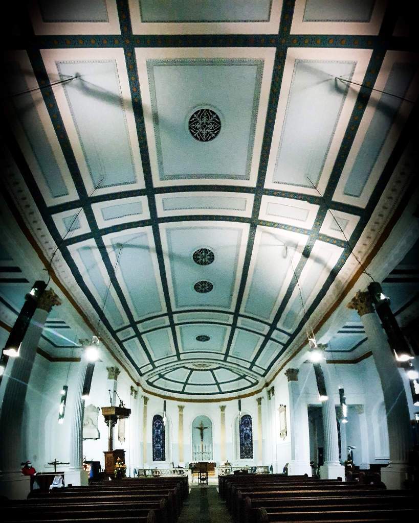 The lighting was added in the 1990s. After first trying it in the crypt, then under the pews, they settled on the ceiling as the best place to put them. Photo: ©️ Suzanne Smithies