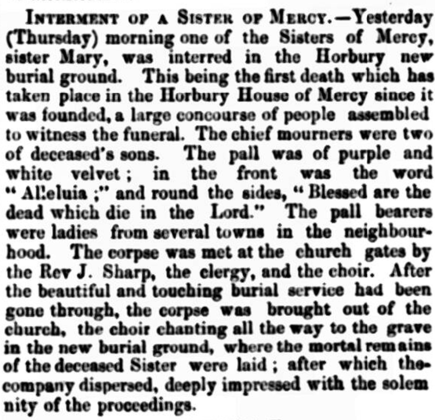 Through the efforts of some philanthropic and benevolent persons, what has been called a House of Mercy, for the reclamation of fallen women, has existed at Horbury, in the West Riding of this county ; but it was too small to accommodate more than a limited number – some 14 or 15 – of such penitents, and exertions, which have been attended with success, have been made to open a new building. That opening took place on Thursday last, so far as the new House of Mercy is intended to be proceeded with at present.