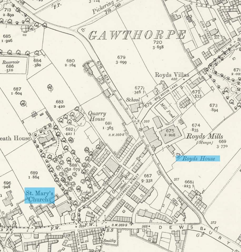 Joseph and Edith lived at Royds House. I’ve included a 1905 map on which we can see where the house was in proximity to the church.