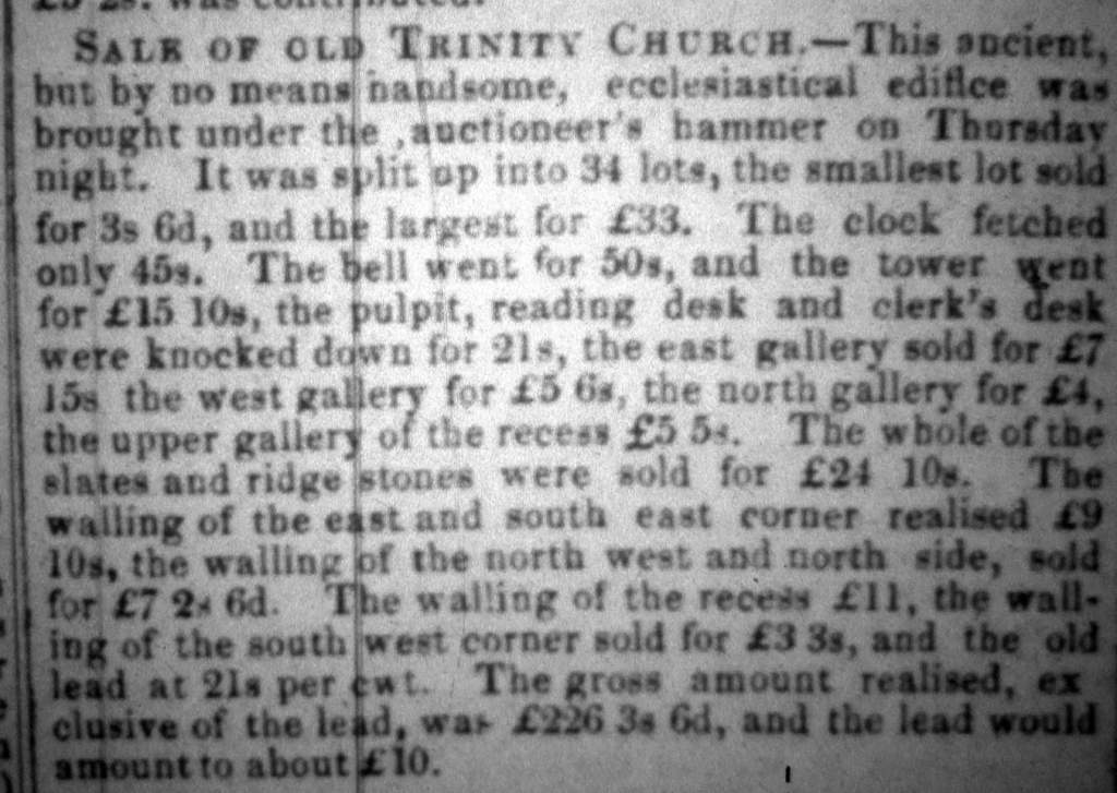 The old church in the market place was closed after Holy Trinity opened in 1865, and the following year the materials of the building were sold by auction for £226-3-6, with demolition and removal of these materials starting the same day as the sale.