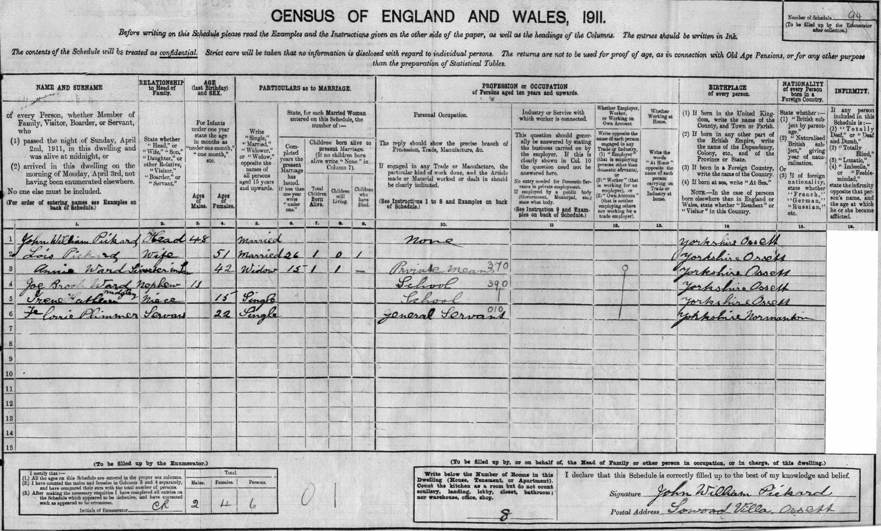 ((These Census Schedules show John Wm Pickard writing his address as Sowood Villa (suggesting that it was he who decided to change the name) and the Enumerator writing it as Sowood House! All very confusing to the future researcher!))