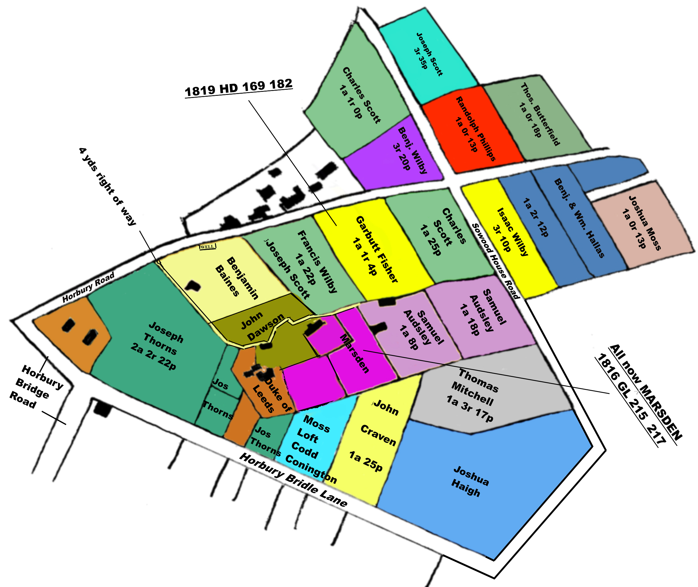 In 1816 John DAWSON sold the lower part of his Plot to Mary MARSDEN (Ref. 1816 GL 215 217).