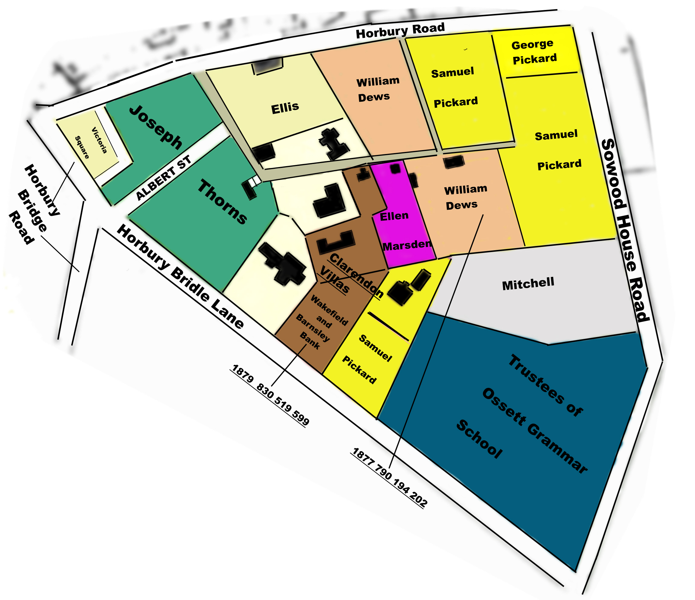 1840 Indenture of Lease and Release dated 14th & 15th February 1840. Lease made between Francis SCOTT of Ossett Common, Clothier and Jesse SCOTT of the same place, Clothier of the 1st part and George PICKARD, of Ossett Green, Grocer of the other part and the Release made or intended to be made between the said Francis SCOTT and Jesse SCOTT of the 1st part and George PICKARD of the second part and George PRESTON ( his son in law), of Horbury, Grocer, of the 3rd part. Of and Concerning all that Close of Land called Lane End Close, situate on Ossett Common and adjoining upon and bounded on the North by the highway leading from Ossett to Horbury, bounded on the East by an Occupation Rd., on the South by a plot of land belonging to Mark SCOTT and on the West by land belonging to the late Joseph MITCHELL and containing by estimation 2 roods and 13 perches more or less and late in the occupation of the said Francis SCOTT and Jesse SCOTT, which said piece of land is the north side of Lot 11 in the Ossett Inclosure Act, together with appurtenances etc. (Ref: 1840 NM 711 737) 1840 Indenture of Lease & Release dated 9th & 10th of July 1840 between Mark SCOTT of Ossett, Clothier of the 1st part and Nathan MITCHELL, Farmer of the other part and the Release between the said Mark SCOTT and Grace his wife of the 1st part and the said Nathan MITCHELL of the other part. All that piece of land situate in Ossett Middle Common containing 2 acres 12 perches being a close of land purchased by Chas. SCOTT deceased of the Commissioners of the Inclosure Act and described as LOT 11 which is bounded on or towards the north by the other moiety of the said close of land, which was lately purchased by George PICKARD of the representatives of John SCOTT, on or towards the East by an occupation rd leading from Ossett to Horbury, on or towards the south by property belonging to the said Nathan MITCHELL on or towards the west by property of Josh. MITCHELL. deceased and now in the occupation of Nathan MITCHELL, with all appurtenances belonging etc. the said Indenture of Lease & Release by the said Mark SCOTT is witnessed etc. (Ref: 1840 NQ 52 2).